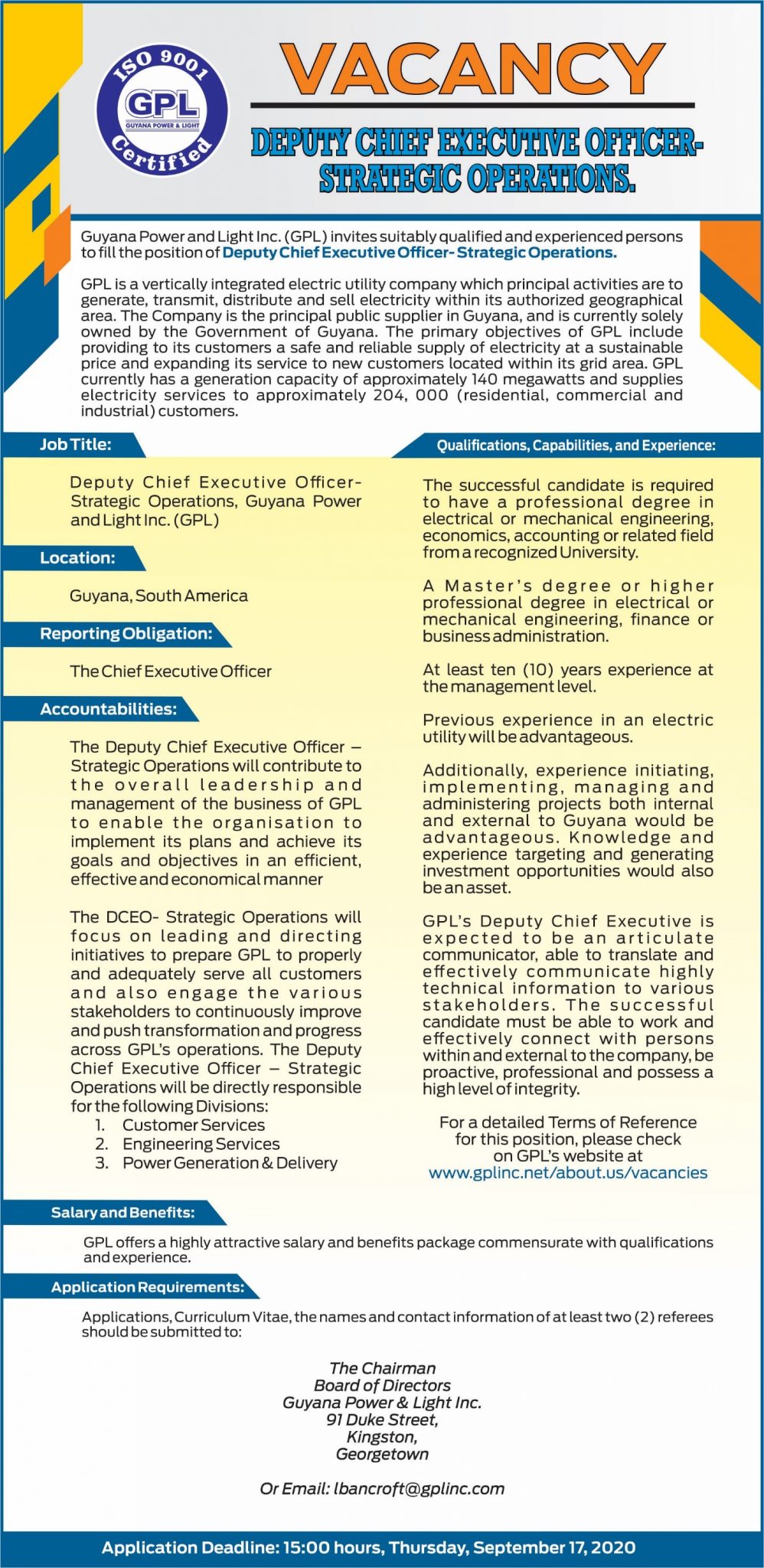 September 10, 2020   Carilec   Comments Off on GPL – Deputy Chief Executive Officer – Strategic Operations