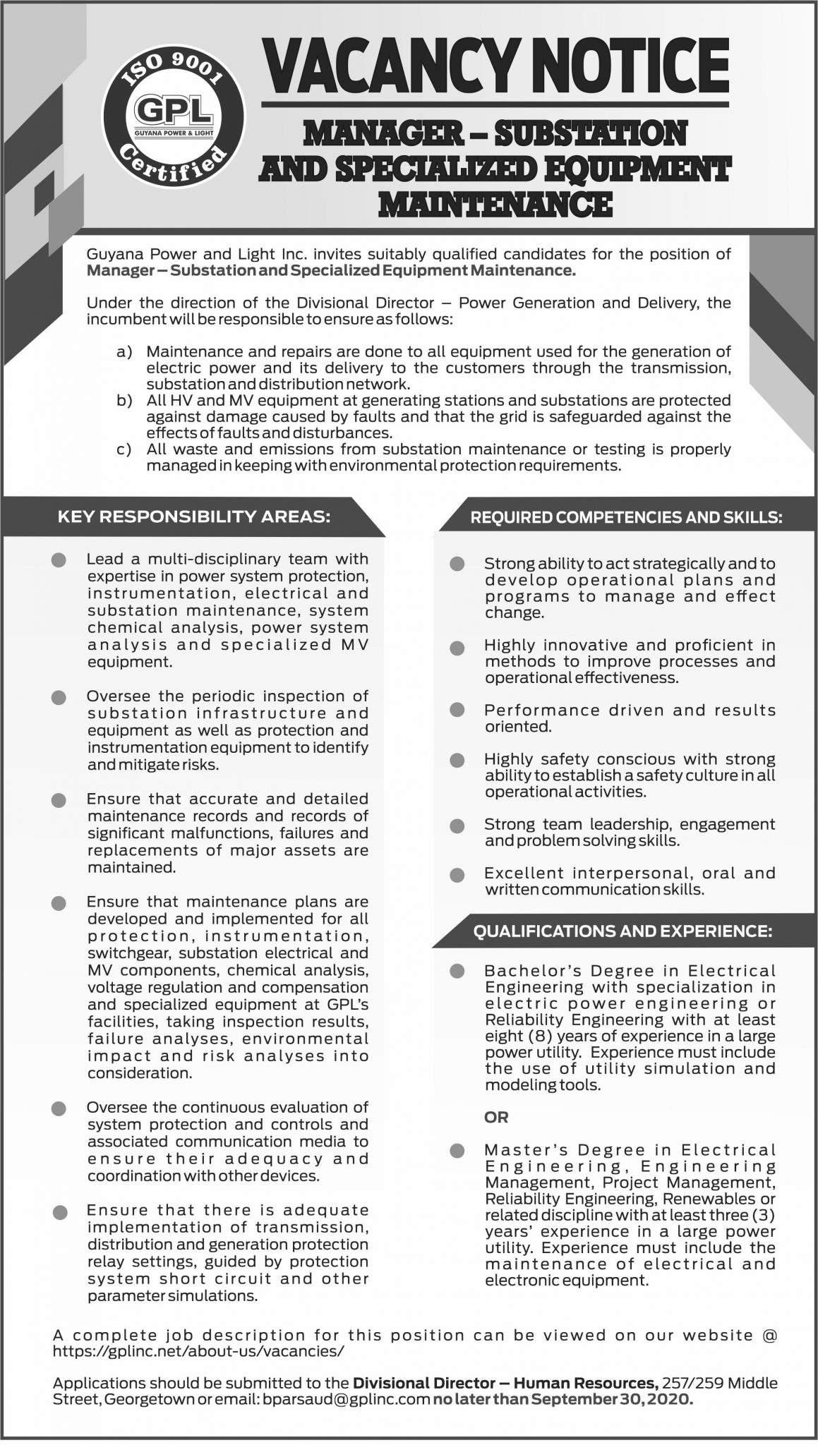 Applications should be submitted to the Divisional Director – Human Resources, 257/259 Middle Street, Georgetown or email: bparsaud@gplinc.com no later than September 30, 2020.