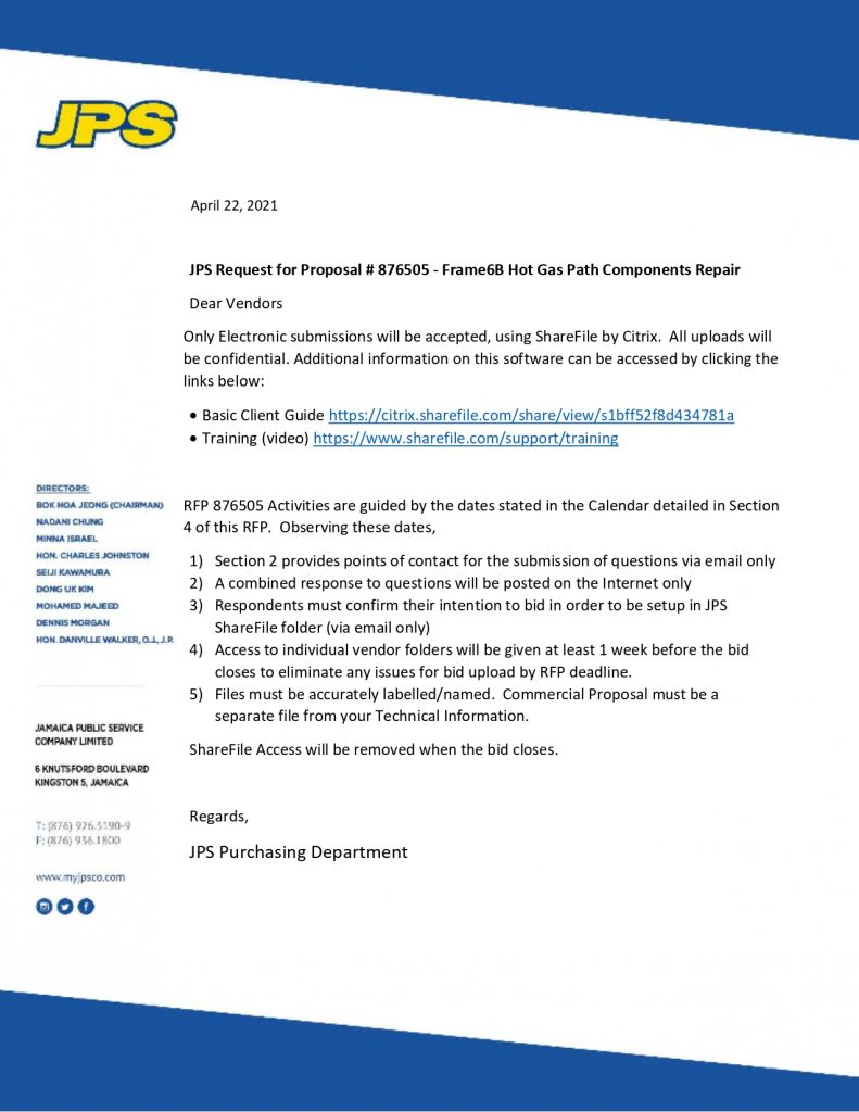 JPS RFP # 876505 – Frame6B HGP Repairs ADDENDUM 1 (Updated 10 May, 2021)