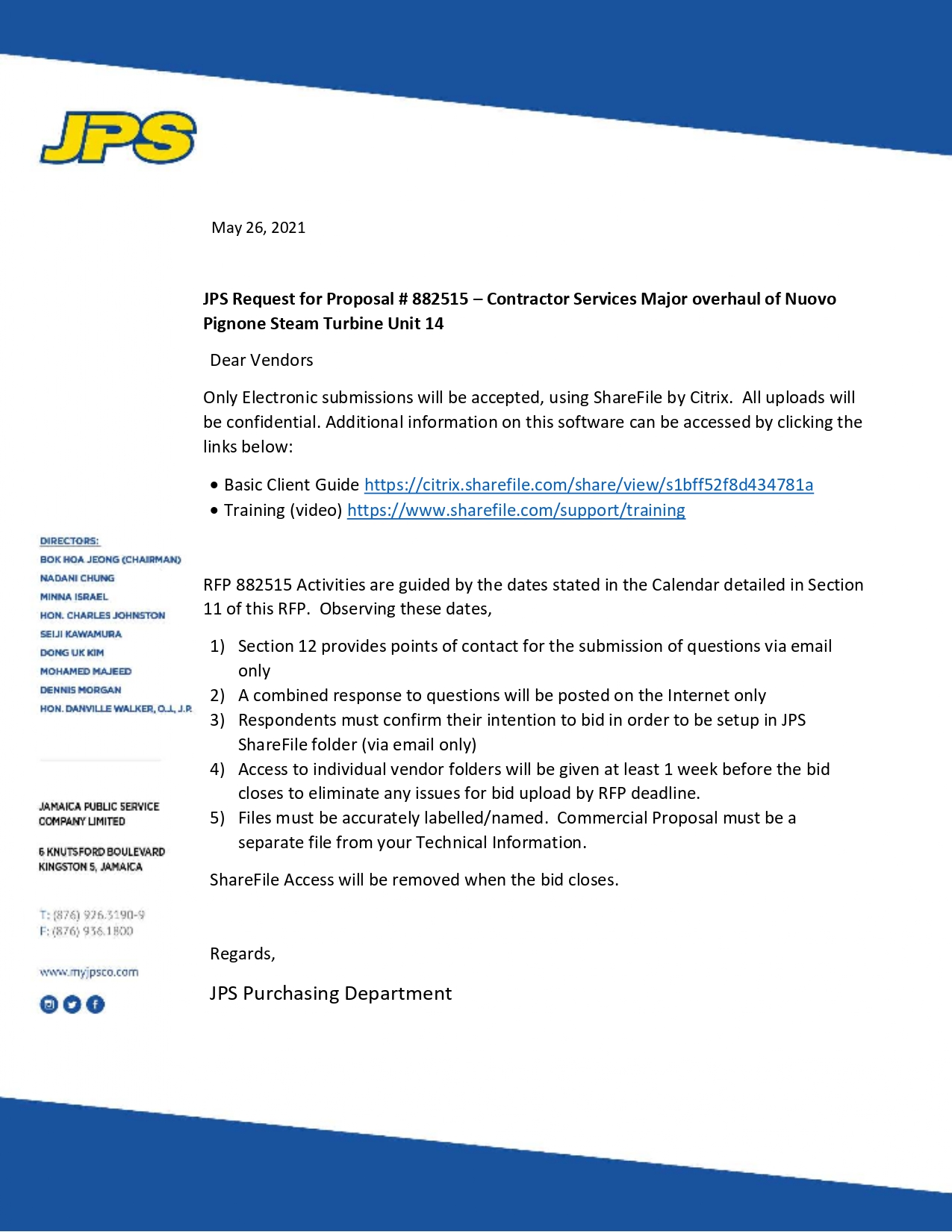 JPS RFP 882515 – Contractor Services Major Overhaul EXTENSION (Updated 29th June, 2021)