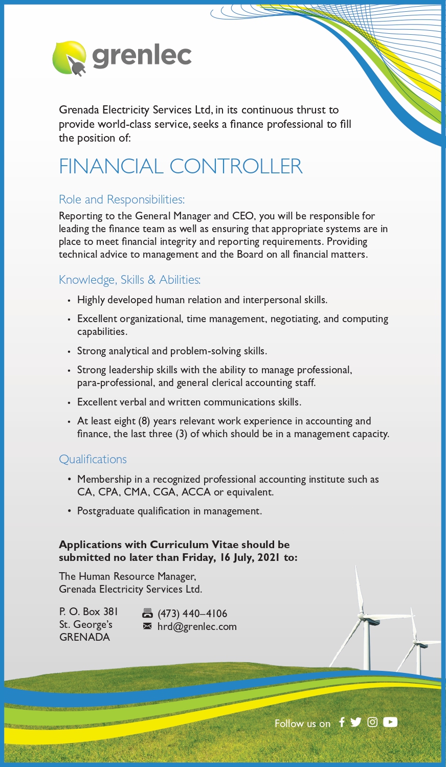 June 29, 2021   Carilec   Comments Off on GRENLEC – Financial Controller