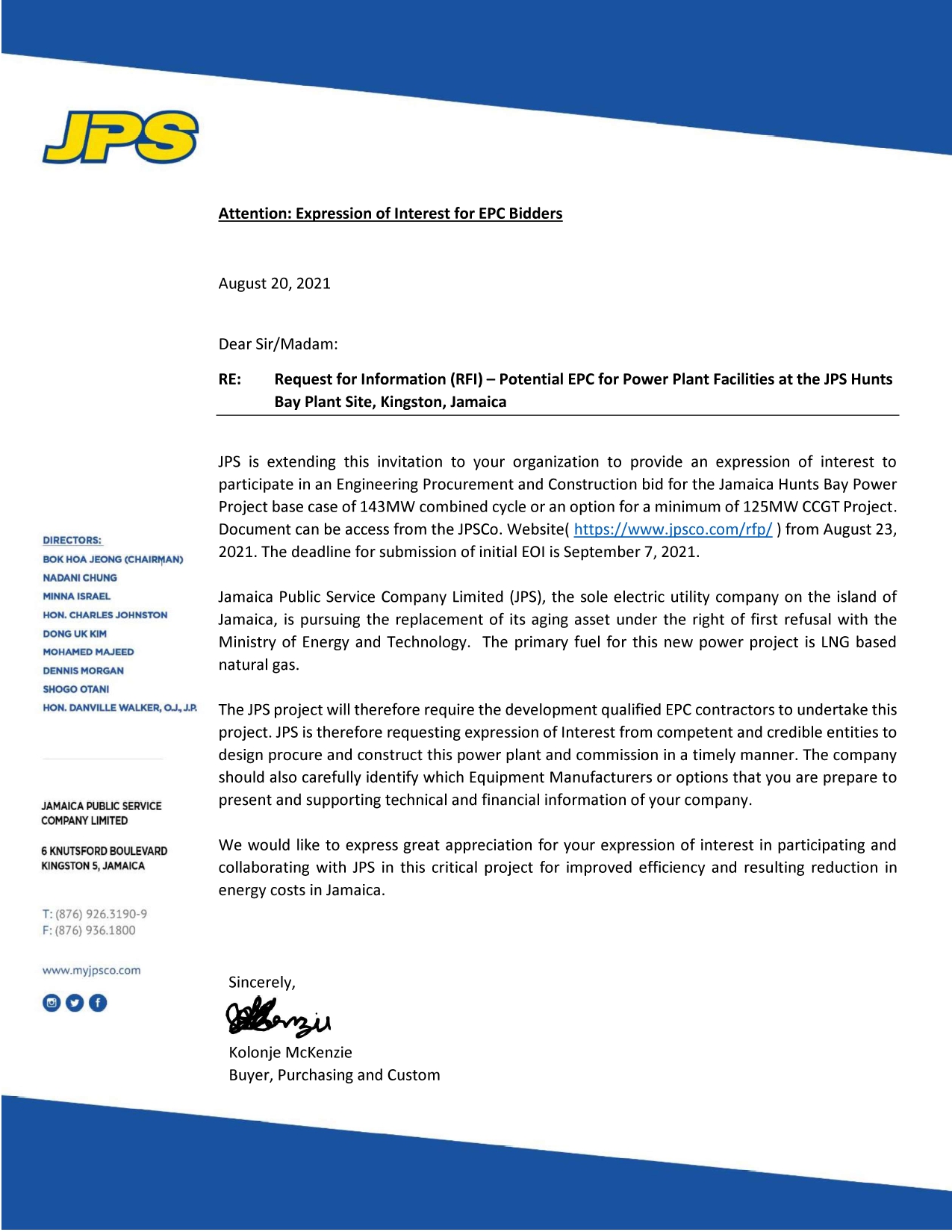 • JPS RFI #891284 – Potential EPC for Power Plant Facilities at the JPS Hunts Bay Plant Site, Kingston, Jamaica