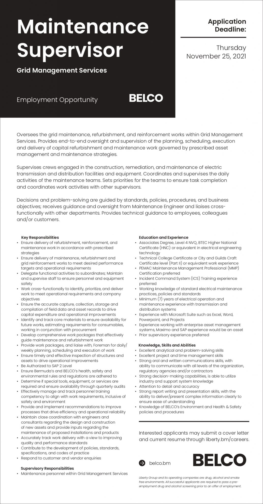 November 24, 2021   Carilec   Comments Off on BELCO – Maintenance Supervisor Grid Management Services