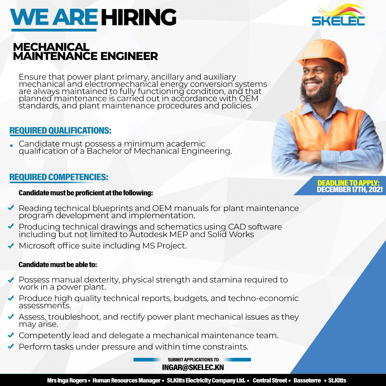 November 29, 2021   Carilec   Comments Off on SKELEC – Mechanical Maintenance Engineer