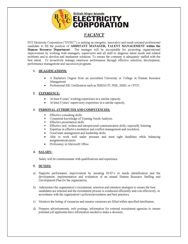 BVIEC – Assistant Manager, Talent Management