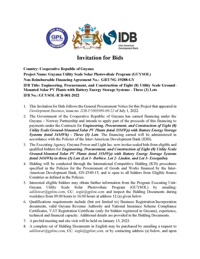 • Invitation to Bid GPL – Guyana Utility Scale Solar Photovoltaic Program (GUYSOL)