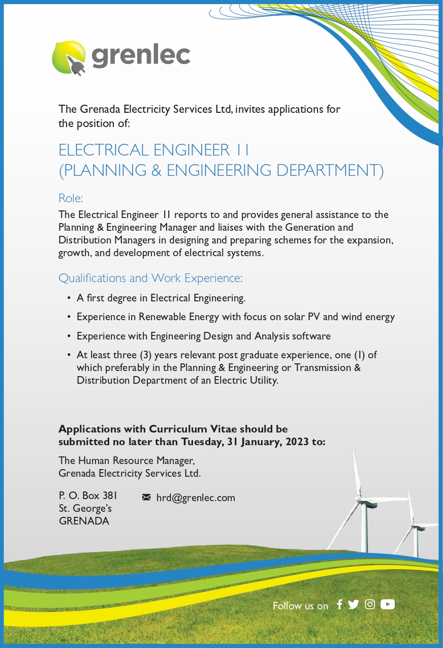 January 18, 2023   Carilec   Comments Off on GRENLEC – Electrical Engineer II Planning & Engineering Department