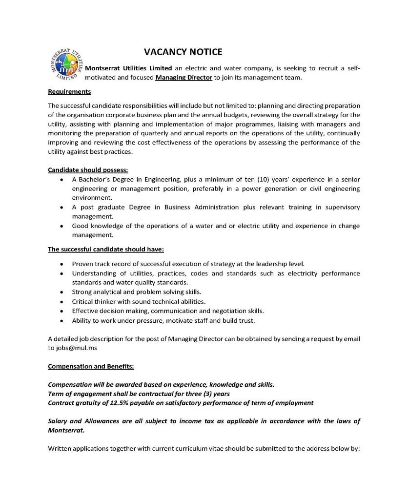 February 27, 2023   Carilec   Comments Off on Montserrat Utilities Ltd. – Managing Director