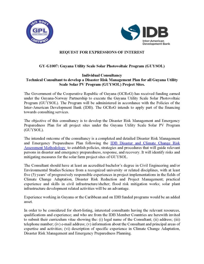 March 7, 2023   Carilec   Comments Off on GY-G1007: Guyana Utility Scale Solar Photovoltaic Program (GUYSOL)