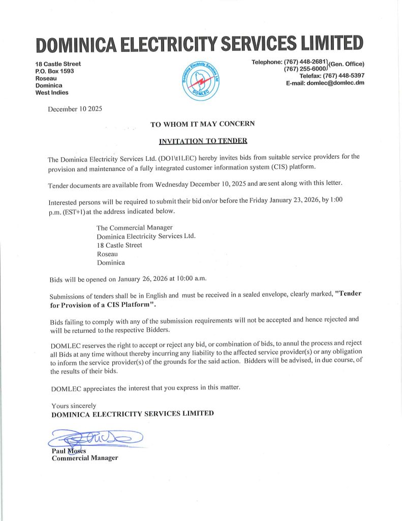 December 15, 2025   Carilec   Comments Off on DOMLEC – Invitation to Tender for Customer Information System