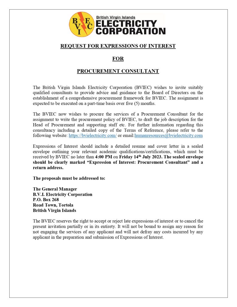 June 27, 2023   Carilec   Comments Off on BVIEC – Procurement Consultant