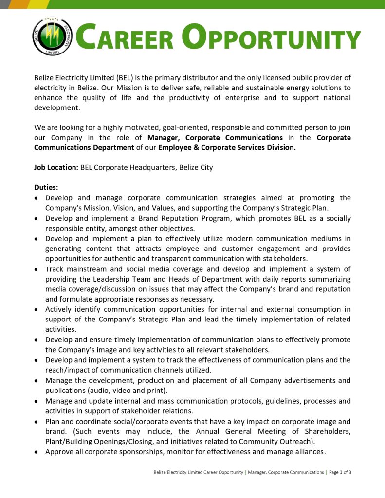 July 13, 2023   Carilec   Comments Off on BEL – Manager, Corporate Communications
