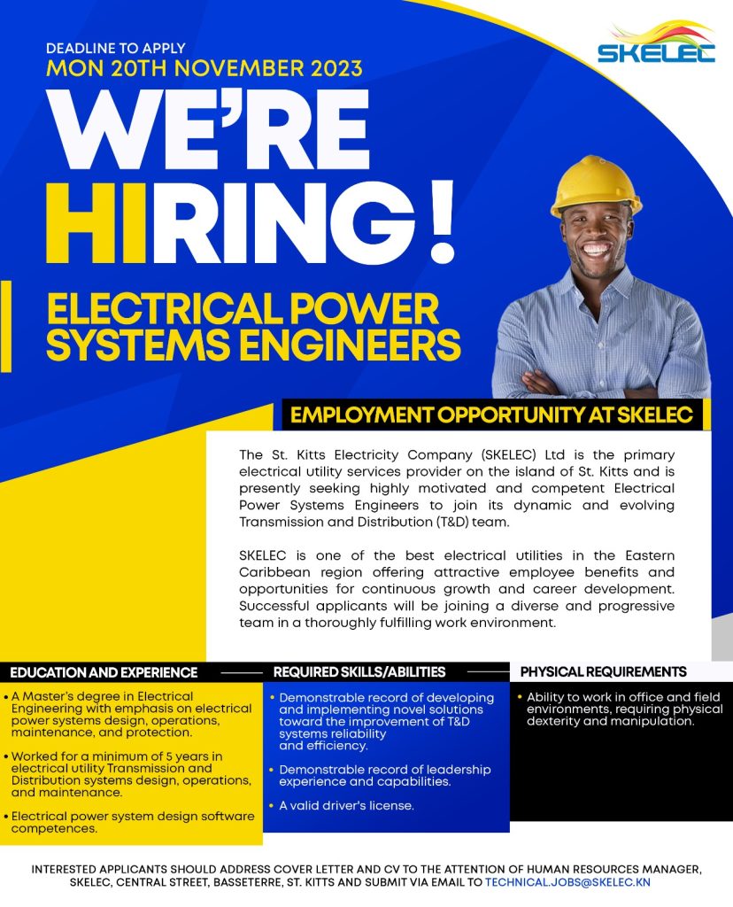 The St. Kitts Electricity Company (SKELEC) Ltd is the primary electrical utility services on the island of St. Kitts and is presently seeking highly motivated and competent electrical power systems engineers to join its dynamic, and evolving Transmission and Distribution (T&D) team. Applicants should possess the following at a minimum: