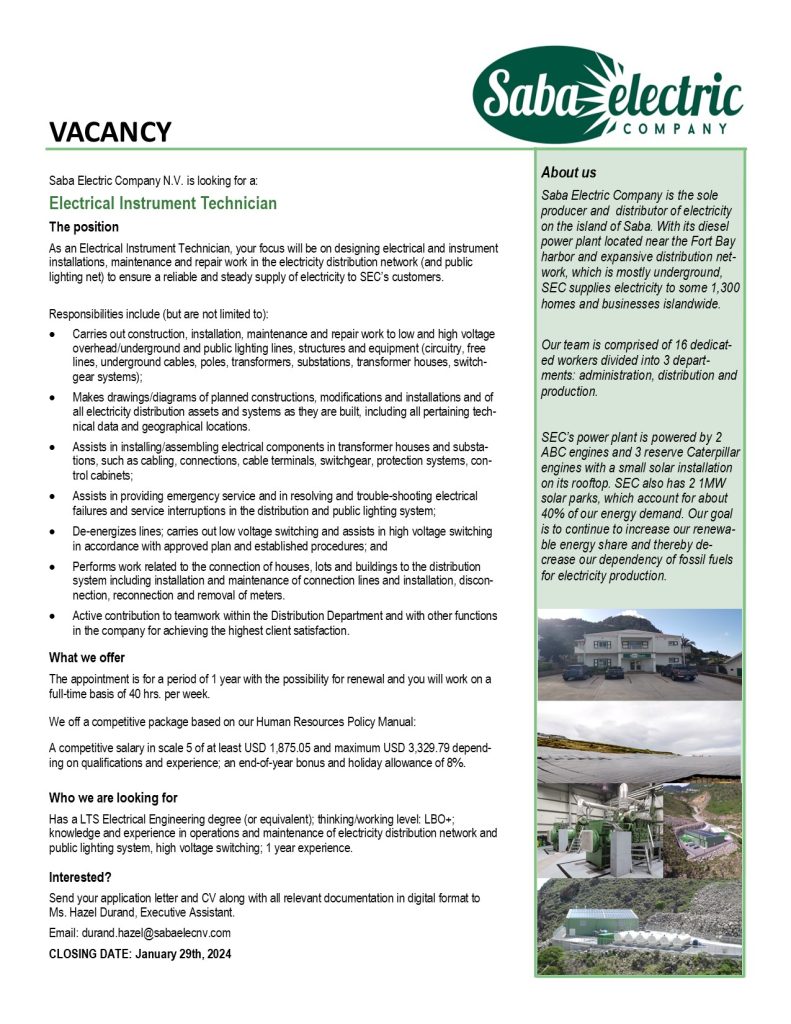 January 16, 2024   Carilec   Comments Off on Saba Electric – Electrical Instrument Technician