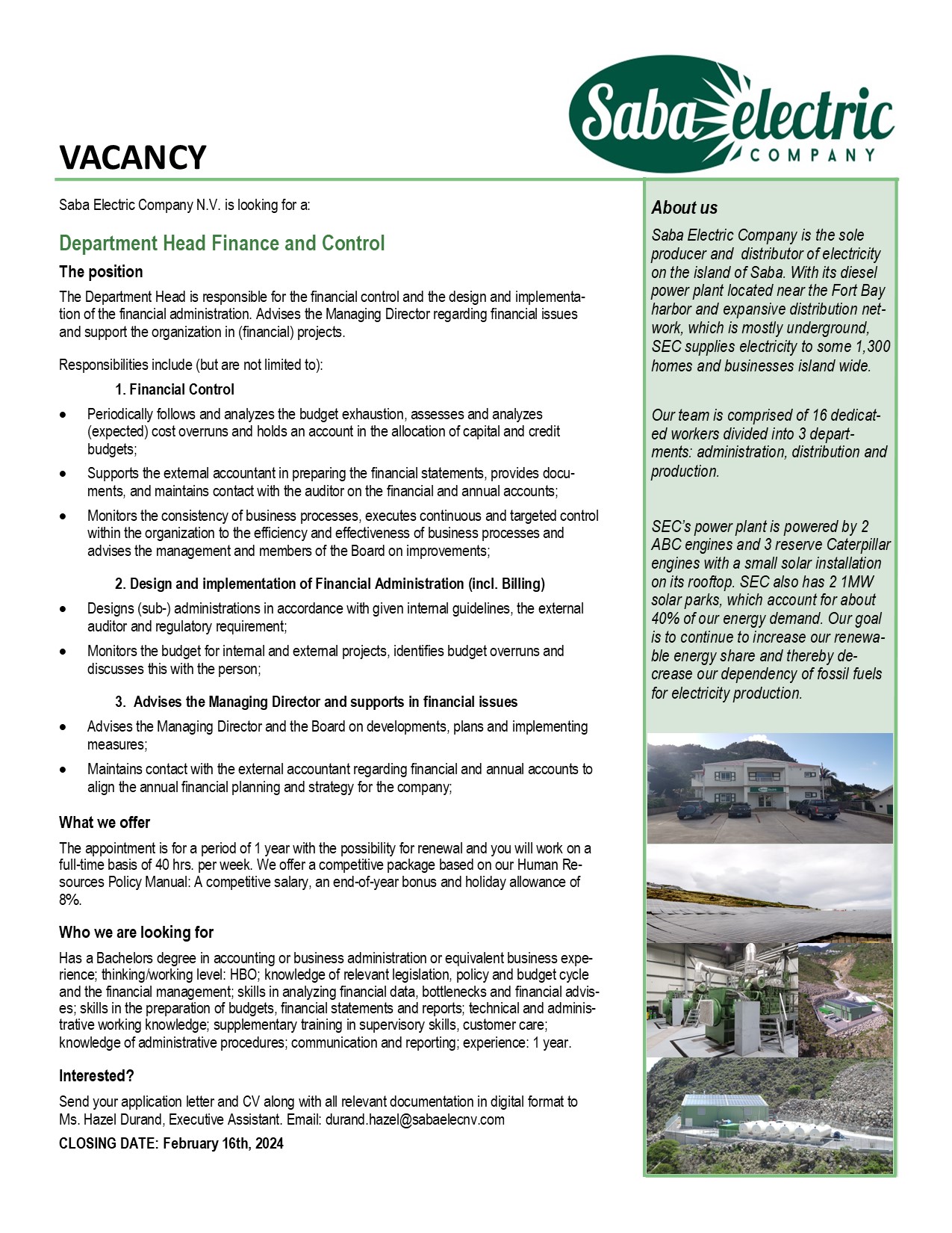 January 30, 2024   Carilec   Comments Off on SABA Electric – Department Head. Finance and Control