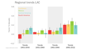 Temperatures: The period from 1991 to 2022 showed an average warming trend of about 0.2 °Celsius per decade (and higher in Mexico and the Caribbean). This was the strongest on record since the start of the 30-year baseline measurement periods in 1900. As a whole, 2022 was not as warm as 2021 in the region because of the cooling effect of the three-year la Niña.