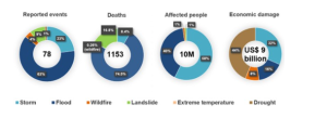 The US$ 9 billion economic damages reported to EM-DAT were mainly due to drought (40%) and storms (32%). The real figures related to the impacts of extreme events are presumed to be worse because of under-reporting and because data on impacts are not available for some countries.