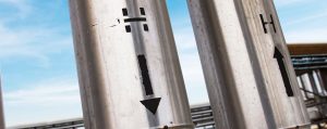 Grey metal Technological tubes and pipelines with arrows and Hydrogen signs. Close-up. Petrochemical industry. Oil refinery and gas processing plant.