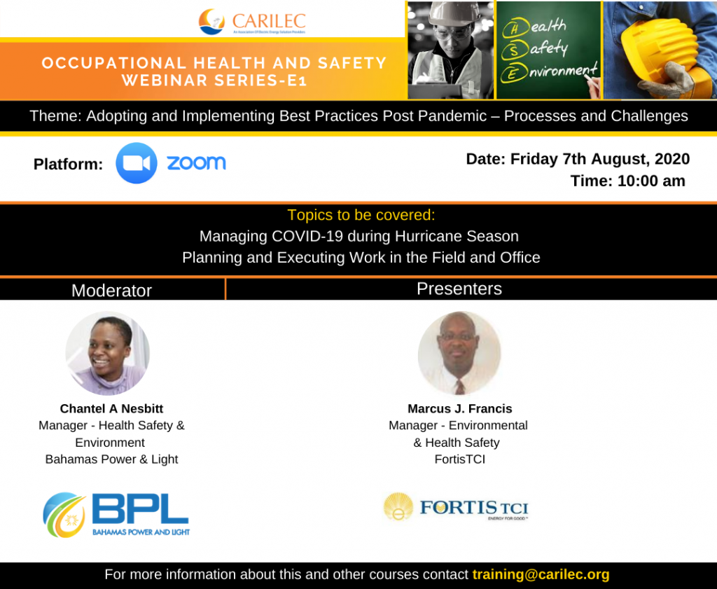 The Caribbean Electric Utilities Services Corporation (CARILEC) invites you to join the premiere of the 2020 Occupational Health and Safety Webinar Series. A number of issues have arisen as a result of the COVID-19 Pandemic. It has affected organizations in much the same way that it has disrupted lives and livelihoods. Life has changed for people and organizations similarly. For example, people are adapting to multi-step sets of actions to activities that were once seen as simple and linear, such as going to the supermarket or eating out.