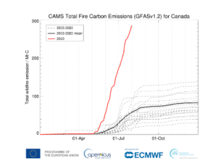 Canada has seen its worst wildfire season on record, harming air quality for millions of people in North America. Fires are now burning in the Canadian Arctic. The Copernicus Atmosphere Monitoring Service (CAMS) reported that as of the end of July, the total estimated wildfire carbon emissions for the year to date reached double the previous Canadian annual total. CAMS recorded a significant increase in intensity and emissions from wildfires in the eastern Mediterranean during the second half of July, particularly in Greece. In accordance with the GFAS dataset, the emissions from these wildfires have been the highest for this period of time in Greece in the last 21 years.