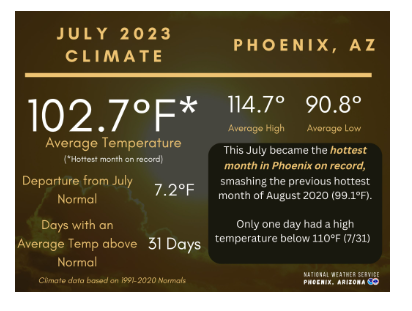 July was the hottest month on record for Phoenix, Arizona, with an average temperature of 102.7°F (39.3°C), according to the US National Weather Service.