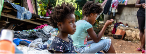 Seven-year-old Farah and her sister eat a meal at a temporary shelter in Marceline, Haiti. She and her family spent two hours under the rubble of their earthquake-destroyed home.
