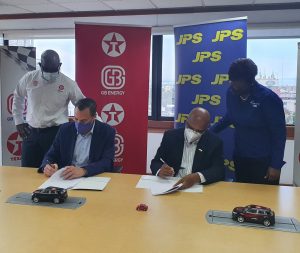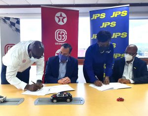 JPS is announcing that it has signed an agreement with GB Energy Texaco for the first installation of Electric Vehicle chargers at select service stations. The first charging station will be at Texaco’s New Kingston location on Trafalgar Road, and will be open to the public by the end of next month. The signing ceremony took place recently at GB Energy’s Head Office in New Kingston.