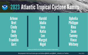 A summary graphic showing an alphabetical list of the 2023 Atlantic tropical cyclone names as selected by the World Meteorological Organization. The official start of the Atlantic hurricane season is June 1 and runs through November 30. (Image credit: NOAA)