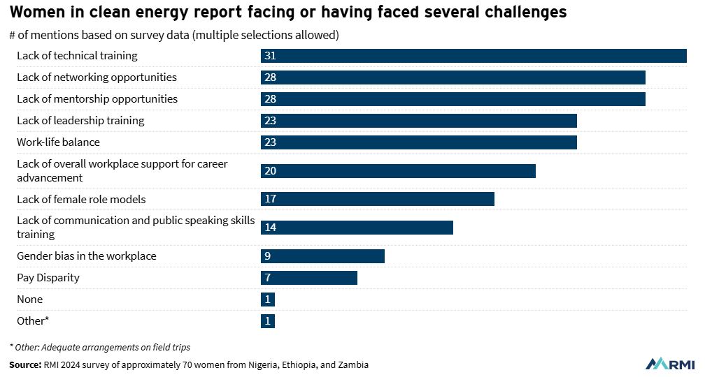 RMI is committed to empowering women leaders in the clean energy sector globally, recognizing that their leadership is critical to the rapid advancement of clean energy and sustainable development goals. To address the need for supporting and growing women’s leadership in minigrid development in Africa, RMI conducted a needs assessment involving 100 women representing more than 95 organizations working in clean energy across three AMP-participating countries: Nigeria, Ethiopia, and Zambia. These women, engaged through survey and in-depth conversations, represent a wide cross section of the energy ecosystem including nonprofit and multilateral organizations; women’s organizations; electricity distribution, generation, and transmission companies; renewable energy project developers; government; and financial institutions. The assessment also provided critical perspectives from women’s organizations and development institutions advancing gender equality in the energy sector in the region.