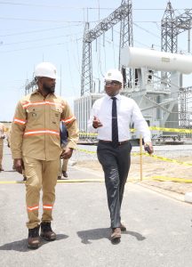 Minister of Public Utilities Marvin Gonzales, left, and T&TEC chairman Romney Thomas, tour T&TEC’s Union/Gandhi 220 KV Circuit No2 in La Brea after the commissioning in April.